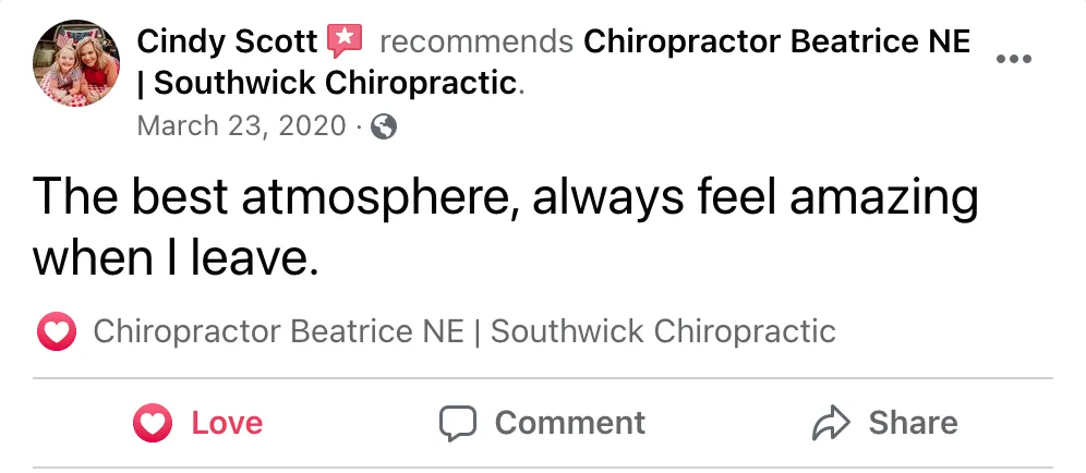 Disclaimer: Procedures and treatments performed by Southwick Chiropractic & Wellness have an inherent success (and failure) rate. Reviews, testimonials and content on this site should not be interpreted as a statement of efficacy of procedures and treatments performed by Southwick Chiropractic & Wellness for anyone else.